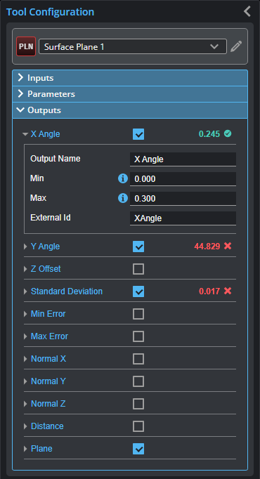 To set what measurement values are considered a Pass, select a measurement in the Outputs list and configure its Min and Max parameters in the Output Properties section. To return a Pass decision, the measurement must be between the maximum and minimum values; the range is inclusive.