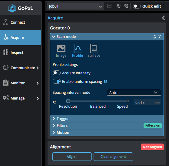 5. If necessary, adjust the settings on the Acquire page to get the best data possible from the scans of the alignment target.