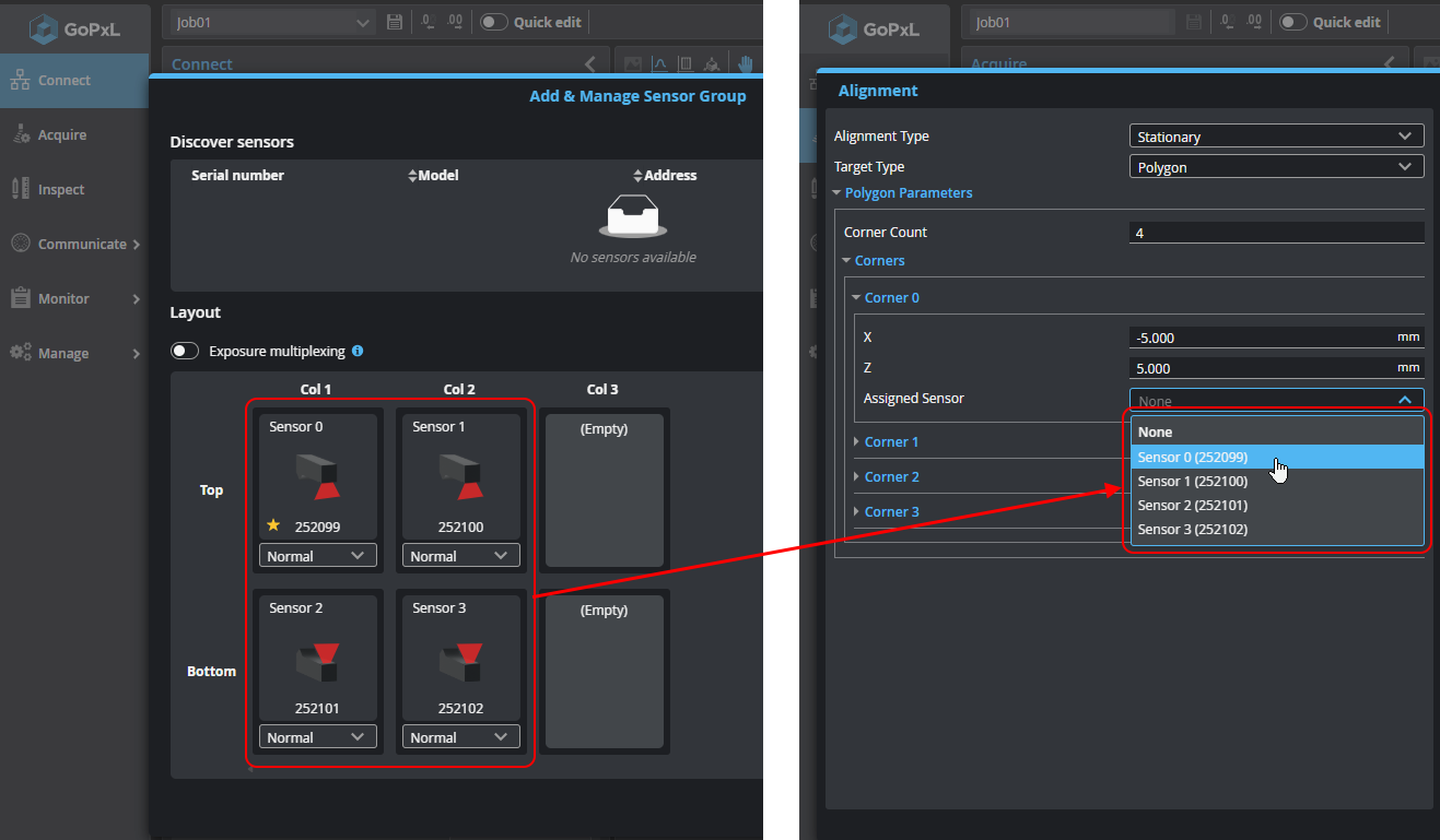 You can use the positions and serial numbers of the sensors in the layout grid in the Layout section in the Add & Manage Sensor Group dialog to help populate the fields for polygon alignment.