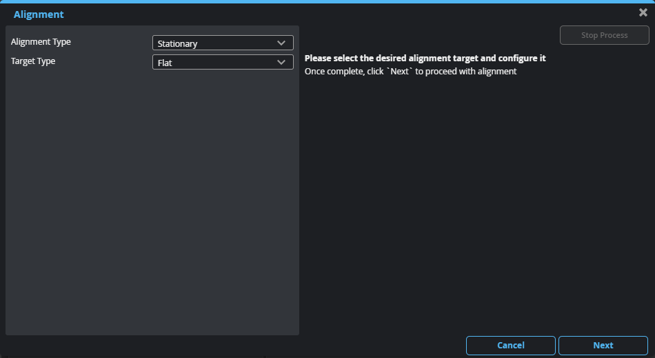 Stationary is used when the alignment target does not move during the alignment procedure. This type of alignment can only compensate for mounting position and orientation in the laser plane or light plane (Y angle and X and Z offsets).