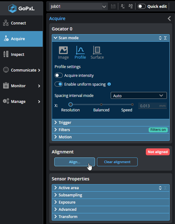 The sensor is aligned using the alignment procedure (described below) or by manually modifying the values under Transform on the Acquire page (for more information, see Transformations). Data points are reported in system coordinates.