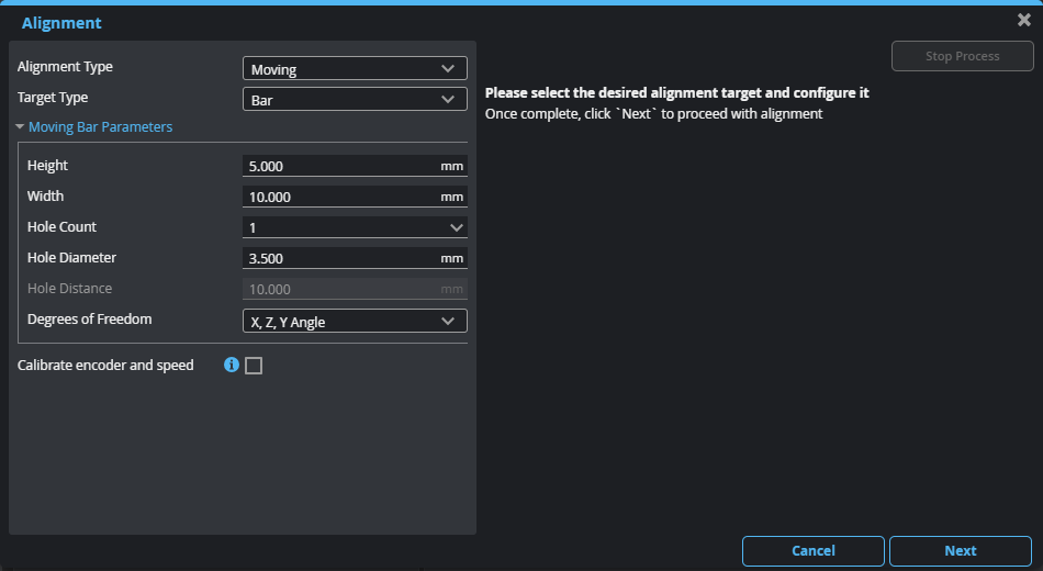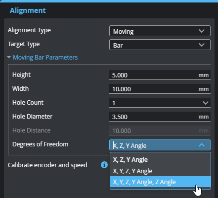 • Bar: Use this to align to a bar alignment target. For information on bar-specific settings, alignment target requirements, and general setup tips, see Stationary and Moving Bar.