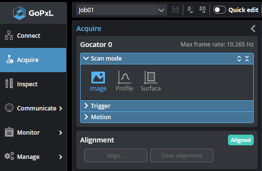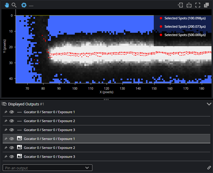 Gocator sensors can't generate 3D points in over-saturated areas (indicated with red) or in under-exposed areas (indicated with blue). If it's not possible to set a single exposure to capture the entire object target with minimal red or blue areas appearing in Image mode, you can try enabling the Multiple exposure feature; the sensor will then combine the exposures to get the best scan data possible. Choose the exposure you want to examine in the Displayed Outputs panel to view each exposure and tune one high exposure for dark areas on the target and one low exposure for bright areas on the target. Note that multiple exposures reduce the maximum speed the sensor can run at.