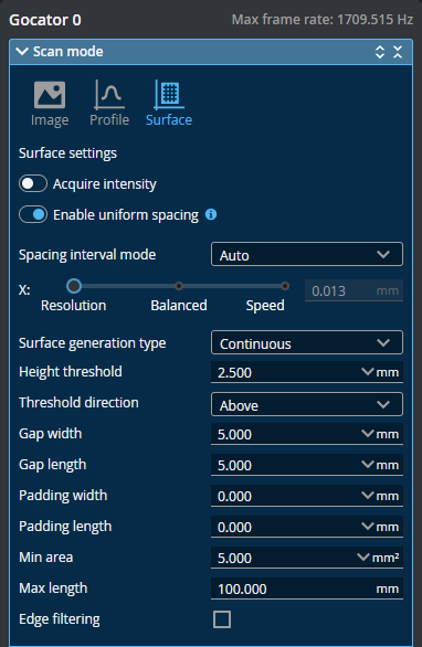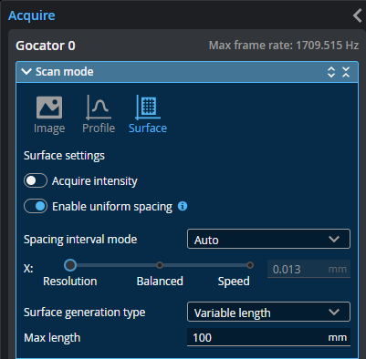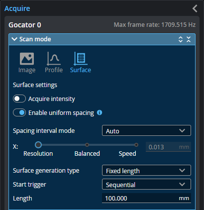 The sensor generates surfaces of a user-configurable fixed length. You must set the length and the start trigger the sensor uses to produce Surface data.