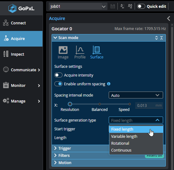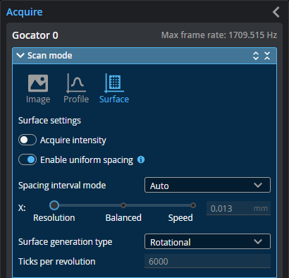 GoPxL provides different ways to generate Surface data, depending on the needs of your application. You configure these Surface generation methods in the Scan Mode section on the Acquire page. Four Surface generation modes are available:
