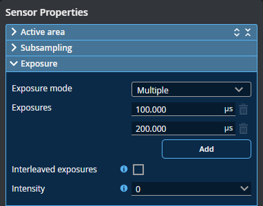 | Interleaved exposures | Outputs the exposures in an interleaved sequence to optimize maximum frame rate. |