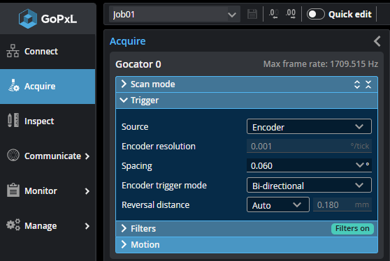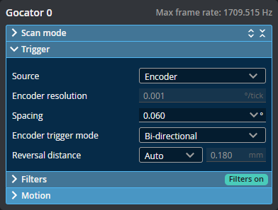 When using encoder triggering (available with line profilers), the current encoder resolution is displayed in the Encoder resolution drop-down as a reference when setting trigger spacing.