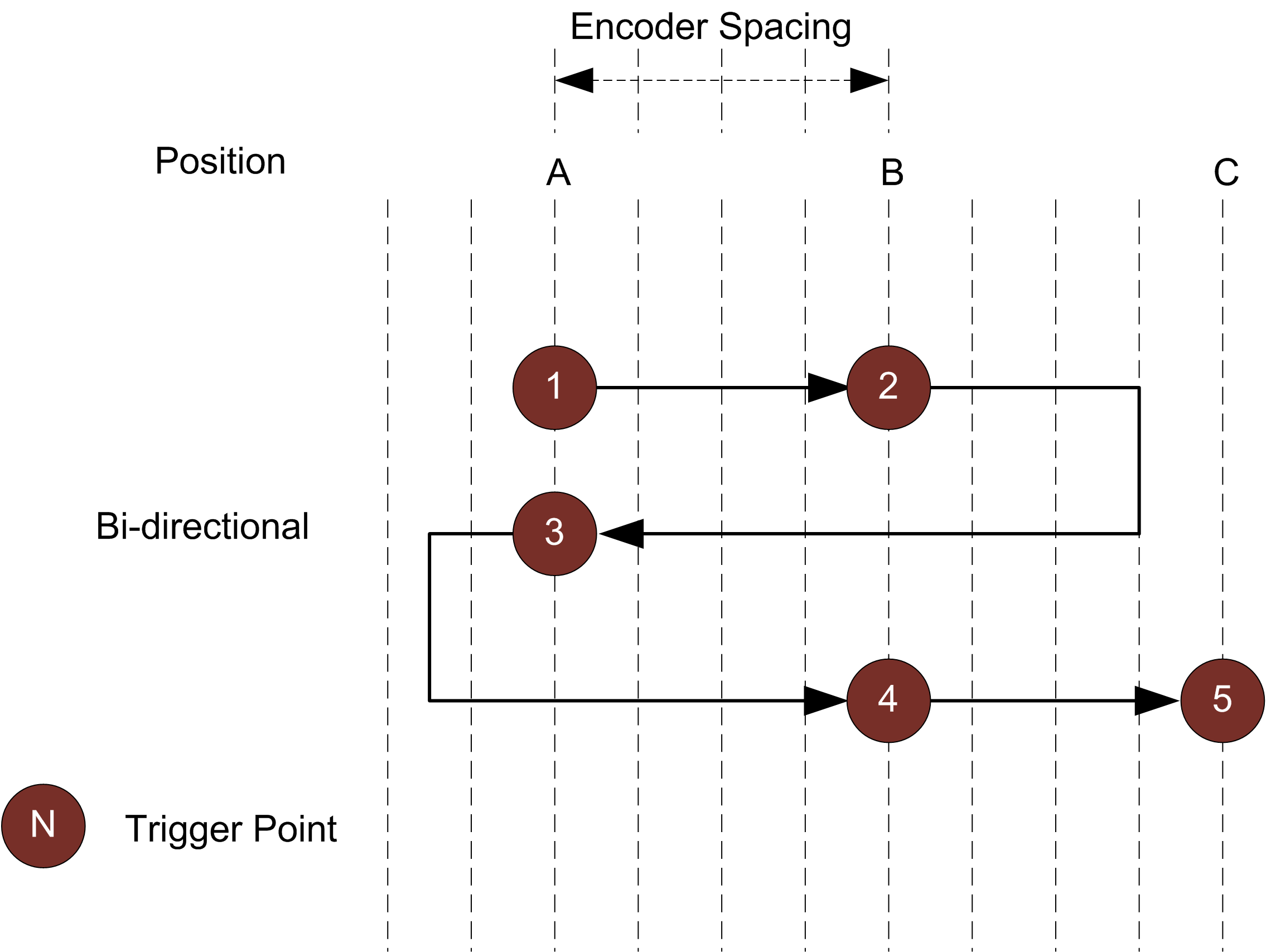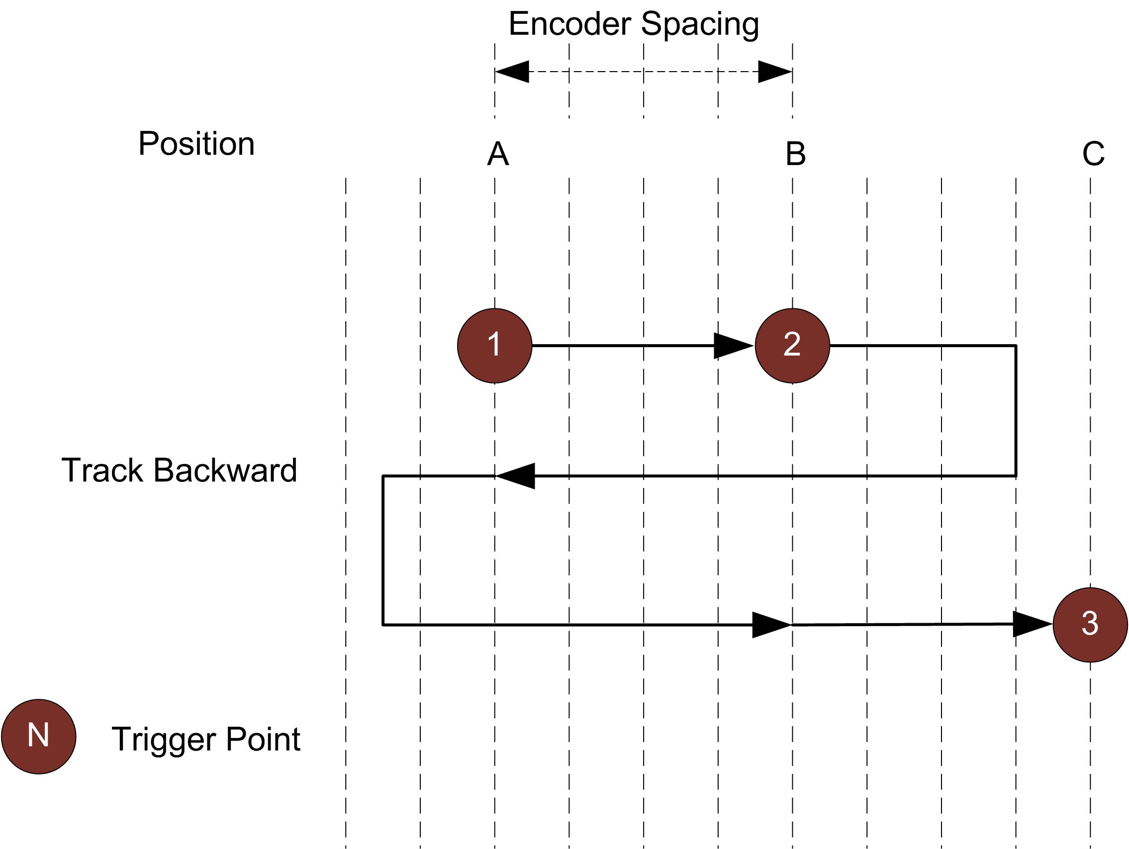 An encoder can be connected to provide triggers in response to motion. Three encoder triggering behaviors are supported. These behaviors are set using the Behavior setting. Note that trigger points are indicated by a circle containing a number in the illustrations below. Track Backward A scan is triggered when the target object moves forward. If the target object moves backward, it must move forward by at least the distance that the target traveled backward (this distance backward is "tracked"), plus one encoder spacing, to trigger the next scan.