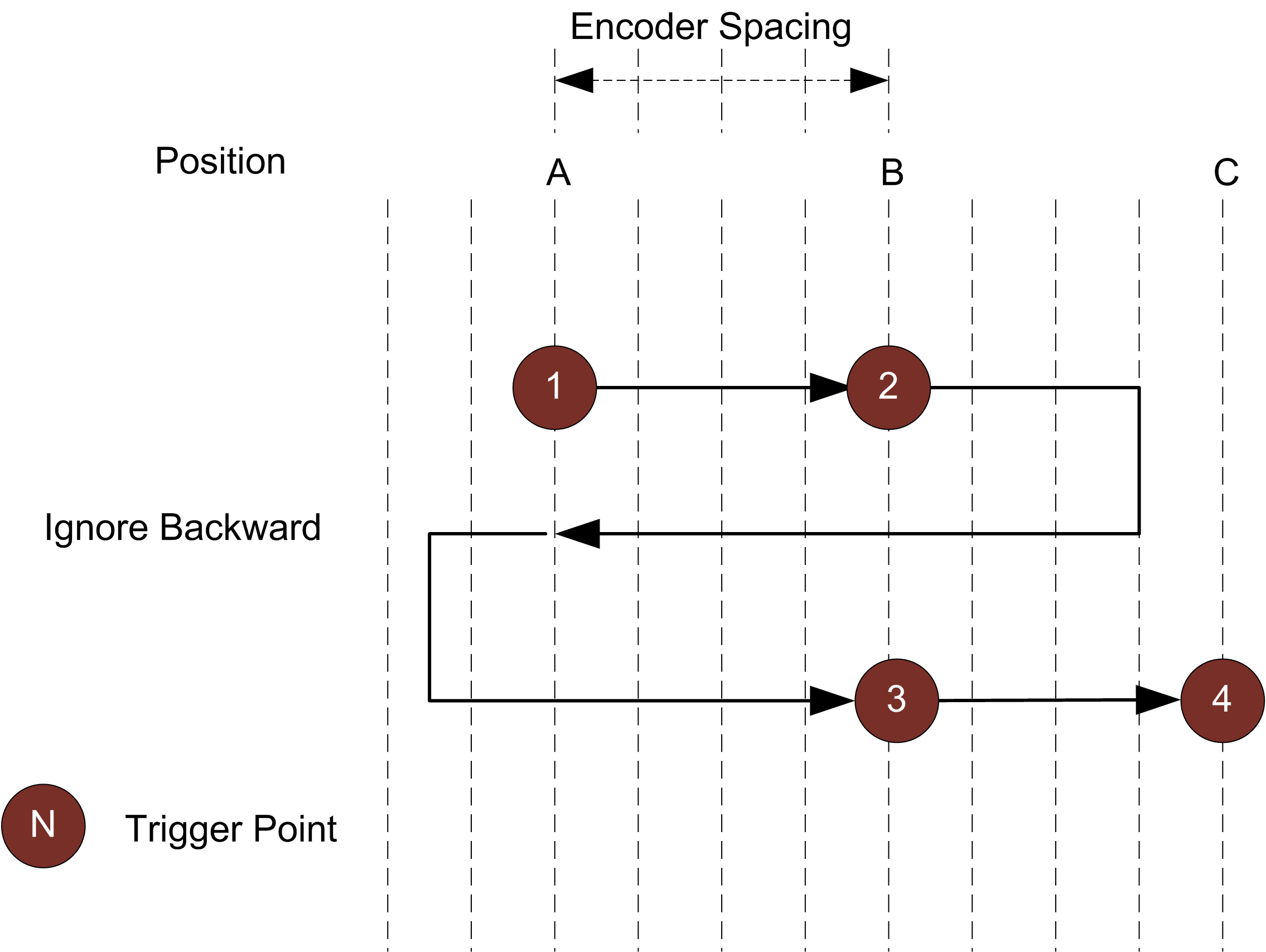 Ignore Backward A scan is triggered only when the target object moves forward. If the target object moves backward, it must move forward by at least the distance of one encoder spacing to trigger the next scan.