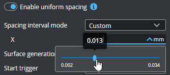 When Enable uniform spacing is enabled, data points are resampled to a uniform spacing. Set the size of the spacing using the Uniform spacing interval parameter (see below).
