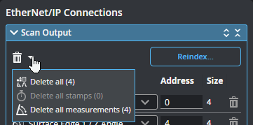 Message buffering Used to enable and disable buffering of scan outputs. You should enable buffering if you are using part detection and if multiple objects may be detected within a period shorter than the polling rate of the PLC. If buffering is enabled with the EtherNet/IP protocol, the buffer is automatically advanced when the Sample State assembly object is read (see EtherNet/IP Protocol Format - PLC Information). Message buffering only applies to tool outputs sent over explicit messaging. For more information on part detection, see Continuous in Surface Generation. |