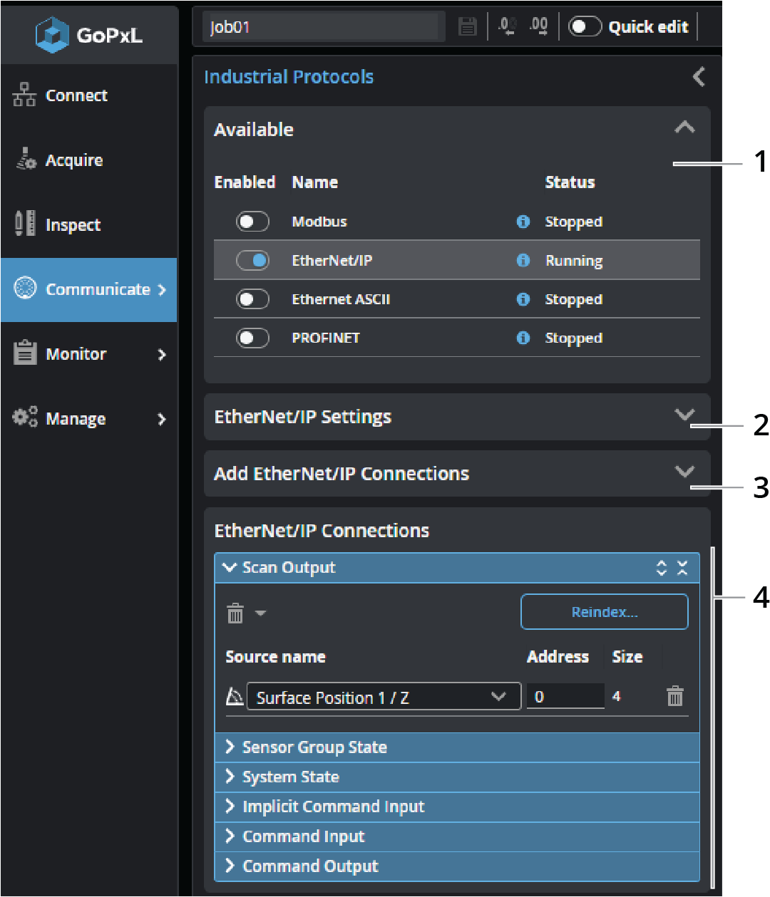 You configure the protocol on the Communicate > Industrial page. After configuring the EtherNet/IP protocol in GoPxL (see below), use the information in EtherNet/IP Protocol Format - PLC Information to configure your PLC.