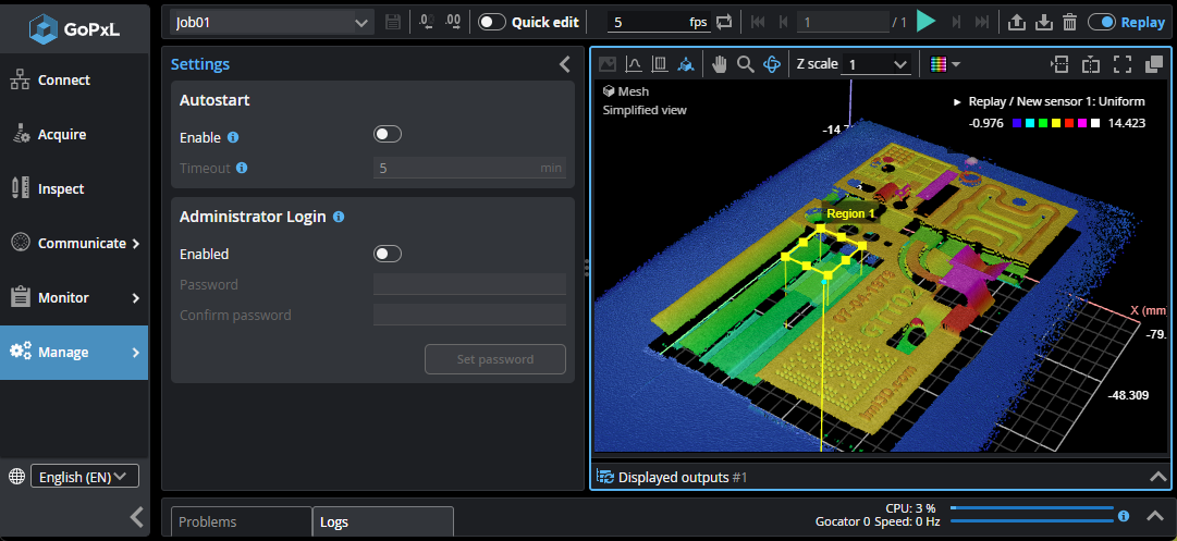 The Support page provides software version information and lets you download a support file for troubleshooting; it also lets you upload a support file to GoPxL. You can also access and download the GoPxL documentation, download the SDK, and go to LMI's online support page. For more information, see Support. |
